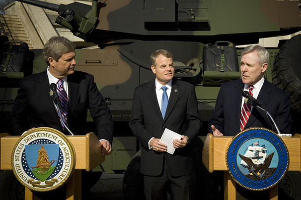 El 21 de Enero de 2010, el Secretario de Agricultura Federal Thomas Vilsack, a la izquierda, el Congresista de los Estados Unidos Mike McIntyre, Presidente de la Subcomisión de Desarrollo Rural, Biotecnología, Cultivos especializados y Servicio Exterior Agrario, y el Sr. Ray Mabus, Secretario de la Marina (SECNAV) atienden a la prensa tras la ceremonia de la firma de un memorandum de entendimiento en el Pentágono. El Departamento de Agricultura de los Estados Unidos y la Marina trabajarán conjuntamente para reducir el consumo de energético derivado de los combustibles fósiles e incrementar la producción de energías renovables.El mundo vinculado a las industrias agrícolas se ha visto conmocionado por una serie de compras y fusiones entre multinacionales del sector que han dado lugar a corporaciones gigantes que van a dictar las políticas mundiales sobre agricultura. En una sucesión vertiginosa se han concretado 4 grandes operaciones en el lapso de sólo 3 meses de este 2016.En julio se anunciaba la fusión de Dow Agrosciences con Du Pont, operación realizada en U$S 56.000 millones; en agosto la estatal Chem China adquiría la suiza Syngenta por U$S 43.000 millones; en septiembre Bayer compraba Monsanto por U$S 66.000 millones y Agrium y Potash, ambas canadienses que elaboran fertilizantes, se fusionaban por U$S 36.000 millones. Las cuatro operaciones totalizaron la gigantesca cifra de U$S 201.000 millones e involucra la producción de fertilizantes, pesticidas, semillas, biogenética y agroinsumos.En un momento en que las materias primas tienen precios bajos es llamativo que se produzcan tantas operaciones en tan poco tiempo. Tal vez el hecho de que el mundo comenzó la transición del empleo de los hidrocarburos fósiles hacia las energías renovables expliquen estos sucesos. Como una de las energías renovables son los biocombustibles que se obtienen a partir de los cultivos tradicionales como la soja o el girasol o no tradicionales como la camelina sativa, es lógico suponer que las principales empresas del sector agrícola intenten obtener posiciones dominantes dentro del mercado de los biocombustibles.De esta manera las empresas y los países que tengan la tecnología y el territorio tendrán gran influencia sobre los medios de transporte y podrán aspirar a una menor dependencia energética de los países productores de hidrocarburos. De hecho esta menor dependencia de los hidrocarburos fósiles tendrá un impacto directo sobre la maquinaria de guerra de las principales potencias militares.Como antecedentes podemos mencionar la primera prueba de un caza F 18 Green Hornet que se llevó a cabo en 2010 en el Día de la Tierra. Este avión de combate estadounidense fue el primero que voló a la velocidad del sonido con una mezcla donde el 50% era biomasa. Barack Obama declaró que este hito reafirmaba el liderazgo de los militares de Estados Unidos. Al año siguiente un caza F 22 Raptor repitió la experiencia de volar a la velocidad del sonido con una mezcla de combustible 50/50. En declaraciones sobre este tema el secretario de la Marina de Estados Unidos, Ray Mabus, afirmó que pretende que en 2020 el 50% del combustible que empleen tanto la Armada como el Cuerpo de Marines sean de origen no fósil. Se trata, según sus palabras, de “mejorar la seguridad y la eficiencia energética incrementando la independencia energética y ayudando a conducir a la nación hacia una economía de energía limpia”En la búsqueda de que la agricultura produjera más y mejores alimentos para la población mundial, la tecnología fue evolucionando para poder lograr ese objetivo. Ese objetivo ha cambiado debido al cambio climático y a la constante generación de diversos conflictos bélicos en diferentes partes del mundo, por lo que la producción de cultivos para alimentos ha derivado en la producción de combustibles que son empleados, en parte, para la guerra.