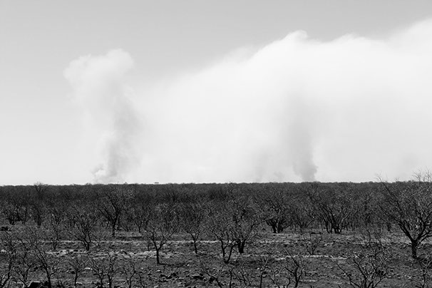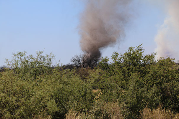 Constantes y grandes remolinos de ceniza (humo negro). Focos de fuegos que surgen inesperadamente por doquier (humo blanco).